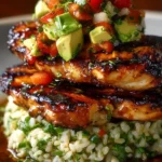 To serve the Honey Lime Chicken Stack, place the rice at the bottom of the plate, layer the grilled chicken on top, and finish with the fresh avocado salsa. This colorful stack looks fantastic on any dining table and can be garnished with additional cilantro if desired.