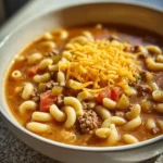A warm, comforting one-pot soup that combines ground beef, macaroni, and cheese for a hearty meal perfect for busy weeknights.