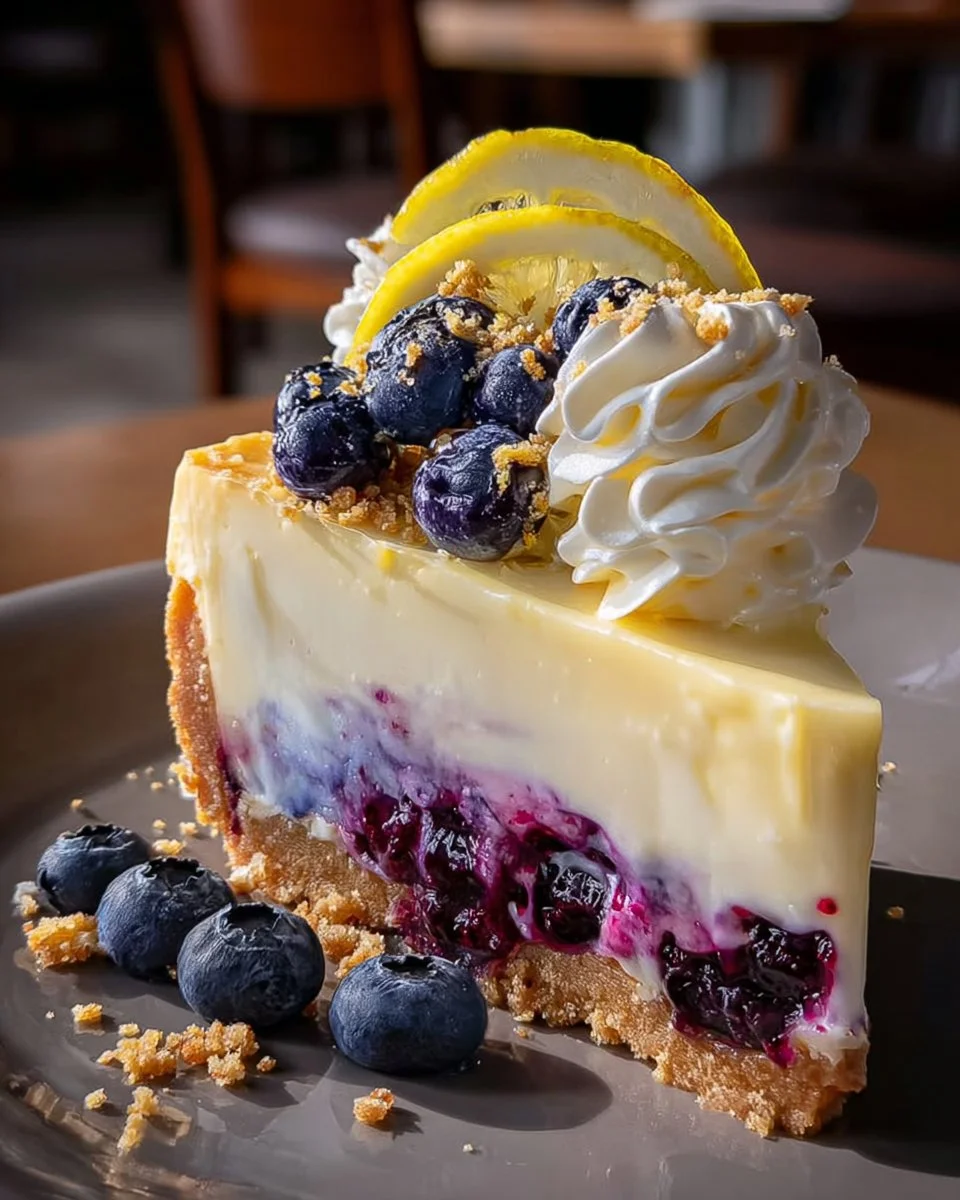 Serve Lemon Blueberry Cheesecake Dream chilled. Slice it into wedges and place on plates. The added lemon slices and whipped cream will give a nice touch and enhance the visual appeal. This cheesecake pairs well with a cup of tea or coffee, making it great for dessert or an afternoon treat.