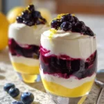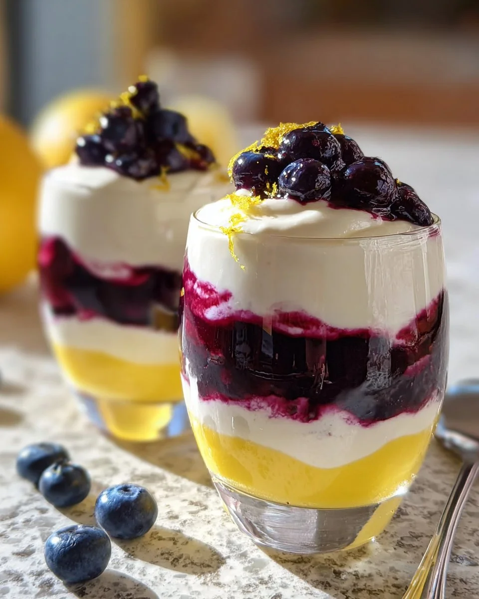 Delicious and refreshing layers of creamy lemon curd, sweet blueberry sauce, and fluffy whipped cream, perfect for any occasion.