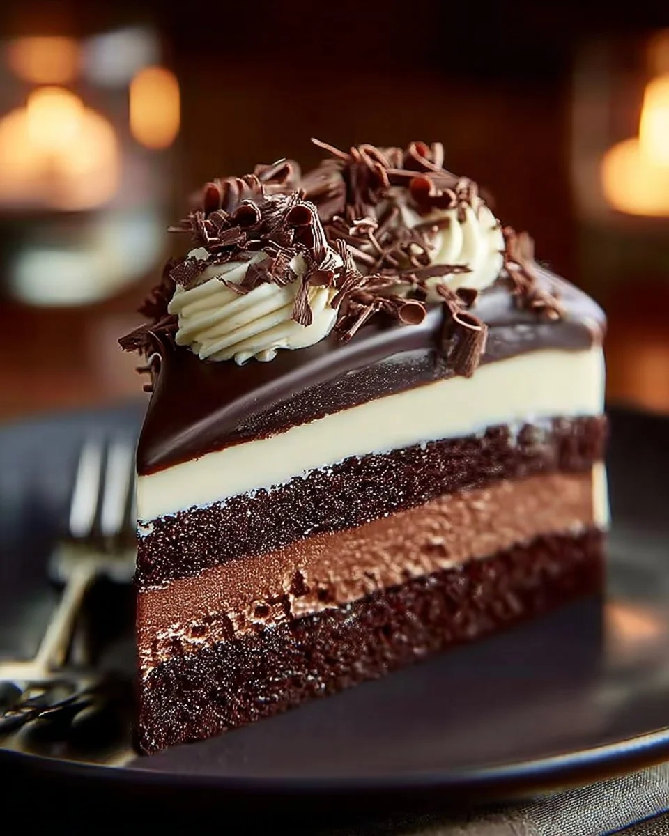 A visually stunning dessert with three layers of smooth chocolate mousse made from dark, milk, and white chocolate. Perfect for special occasions or satisfying chocolate cravings.
