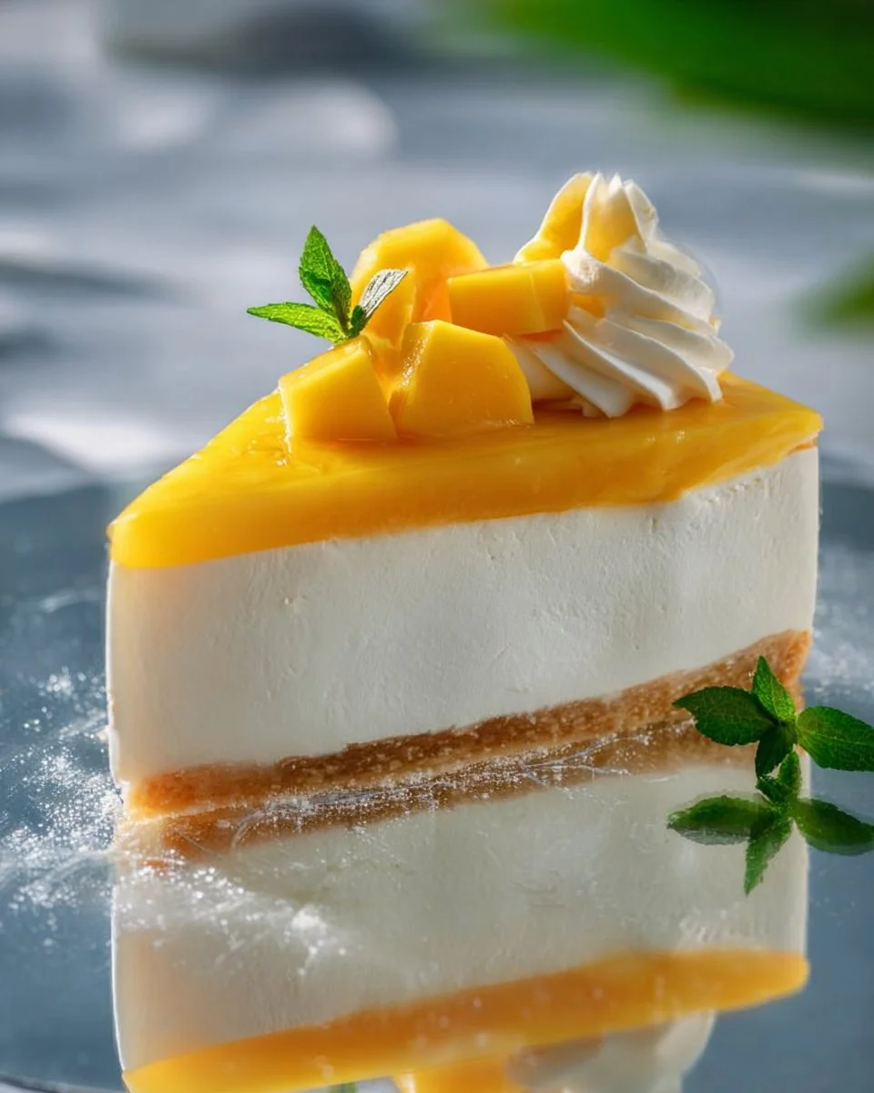 Slice the Mango Mousse Cake into wedges and serve it chilled. It pairs beautifully with a cup of tea or coffee and makes for an elegant dessert for any occasion.