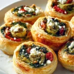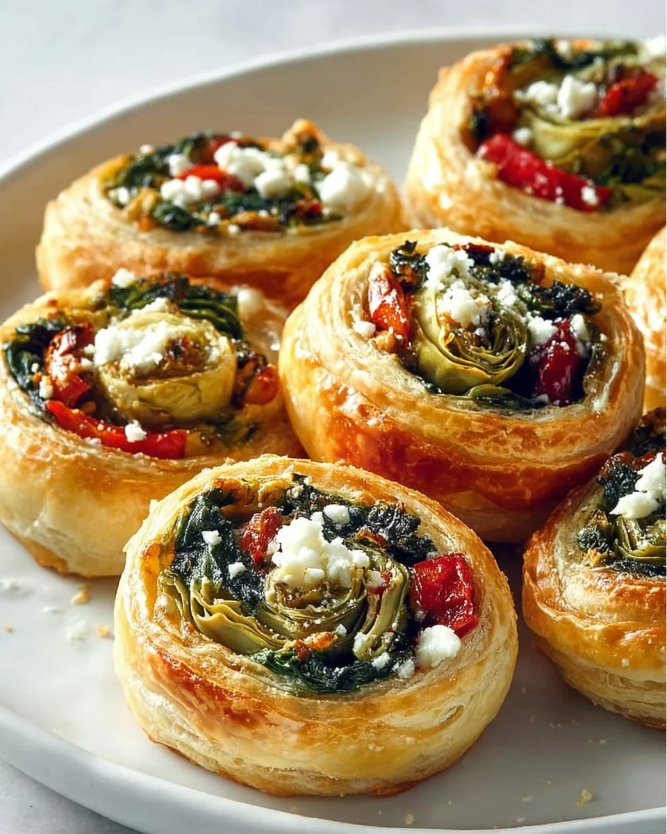 Delightful Mediterranean pinwheels made with feta cheese, olives, and roasted red peppers, wrapped in flaky puff pastry.