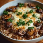 A delicious and comforting dish combining tender beef, savory mushrooms, and creamy goodness, all baked together with rice.