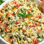 Mediterranean Lemony Rainbow Orzo Salad is a colorful and refreshing dish perfect for any occasion. This salad combines bright vegetables with orzo pasta, all tossed in a zesty lemon dressing. Whether you’re serving it at a picnic, as a side dish, or for lunch, this salad is sure to impress with its vibrant flavors and beautiful appearance.