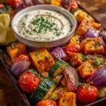 The Mediterranean Roasted Veggie & Feta Sheet-Pan with Lemon Yogurt Sauce is a colorful and tasty dish that brings together the fresh flavors of the Mediterranean. Filled with roasted vegetables and topped with creamy feta cheese, this meal is both simple to prepare and wonderfully satisfying. The addition of lemon yogurt sauce gives it a zesty kick that ties everything together beautifully.