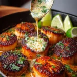 A delightful dish featuring sweet and tender sea scallops seared to perfection and topped with a refreshing lime cilantro sauce.