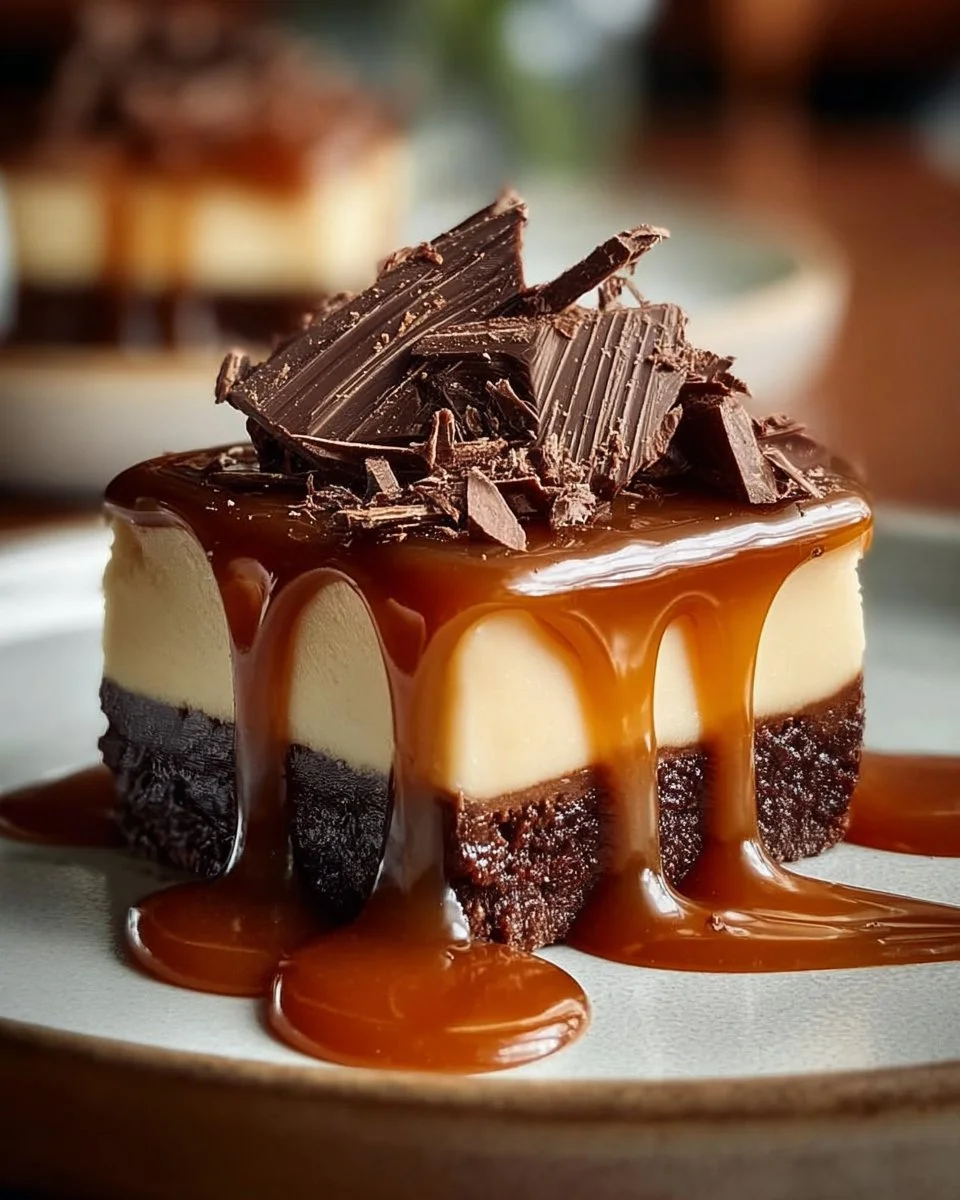 Delightful no-bake cheesecake bites combining rich chocolate, creamy cheesecake, and sweet caramel, perfect for parties or a special treat.