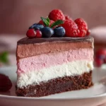 A delicious no-bake cheesecake with layers of chocolate, vanilla, and strawberry flavors. Vegan and gluten-free, it’s perfect for any occasion.