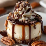 - Assemble Mini Cheesecakes: Drizzle caramel sauce over each cheesecake. Then, top with the chocolate ganache and sprinkle with chopped pecans and mini chocolate chips for added flair.