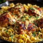 A comforting and delicious dish of juicy chicken thighs cooked in a creamy sauce with perfectly buttered noodles, ideal for busy weeknights.