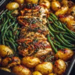 A delicious and comforting meal featuring juicy chicken breasts, tender potatoes, and crisp green beans, all roasted to perfection in one pan.