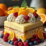 A delightful dessert combining creamy cheesecake with refreshing orange and pineapple flavors, visually appealing and perfect for any occasion.