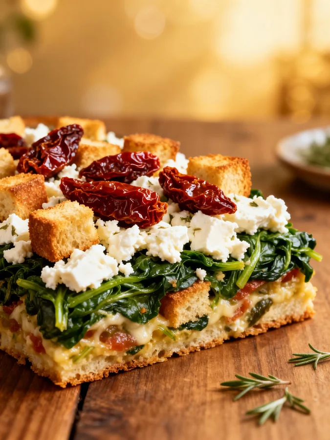 Sprinkle the chopped spinach, sun-dried tomatoes, feta cheese, and Kalamata olives over the bread cubes.