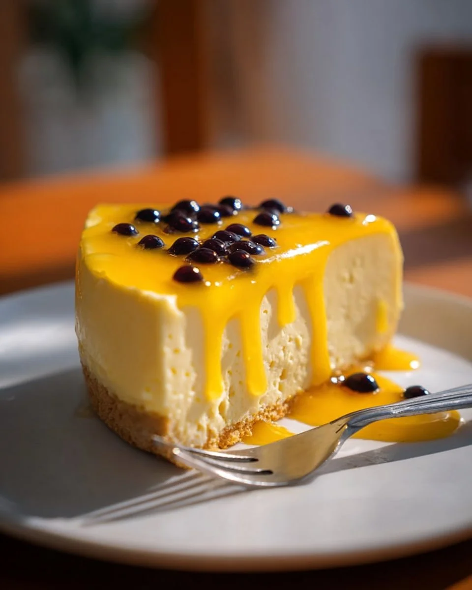 A delightful no-bake Passion Fruit Cheesecake with a creamy texture and tangy flavor, perfect for any occasion.
