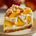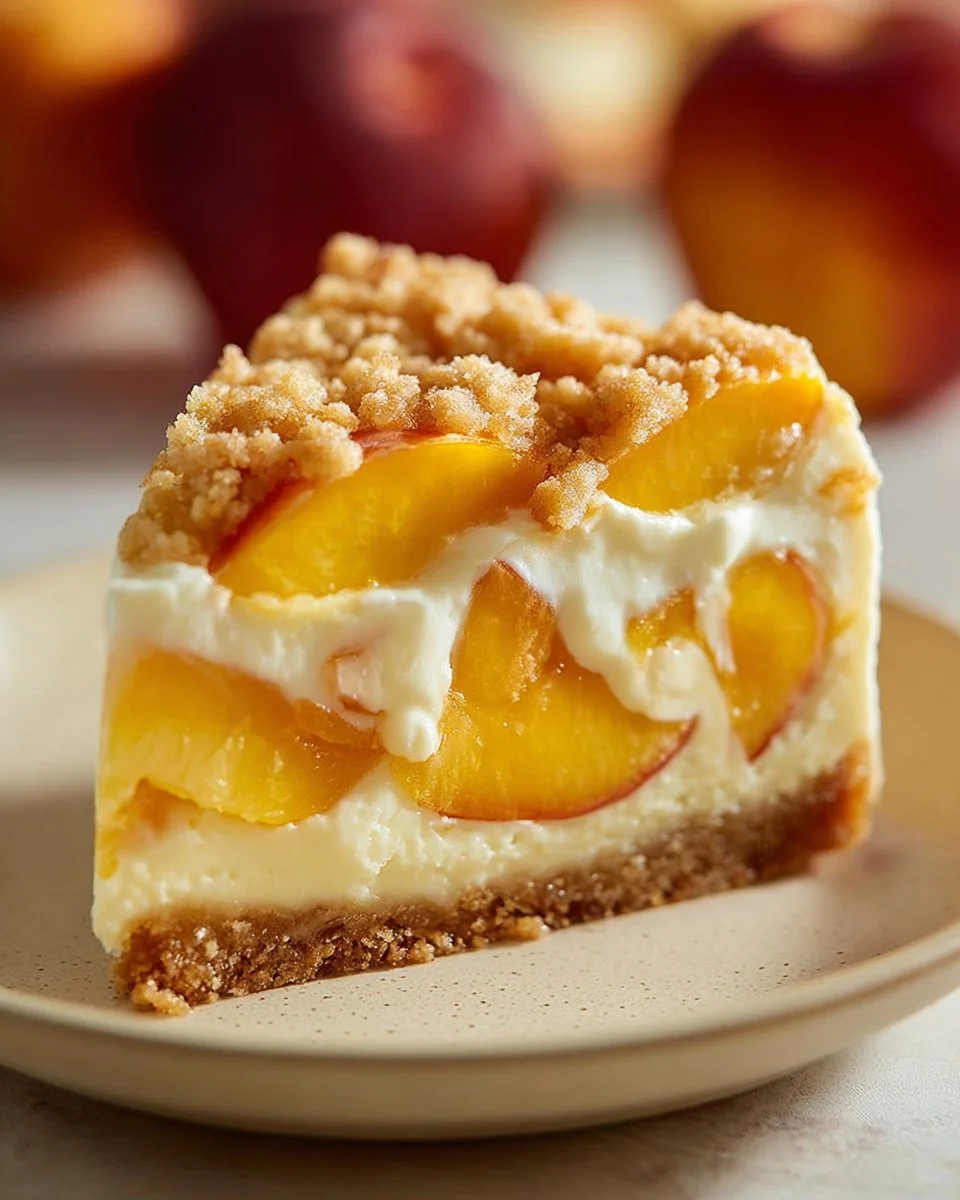 A delightful dessert that combines creamy cheesecake with sweet, spiced peaches and a crunchy crumble topping.