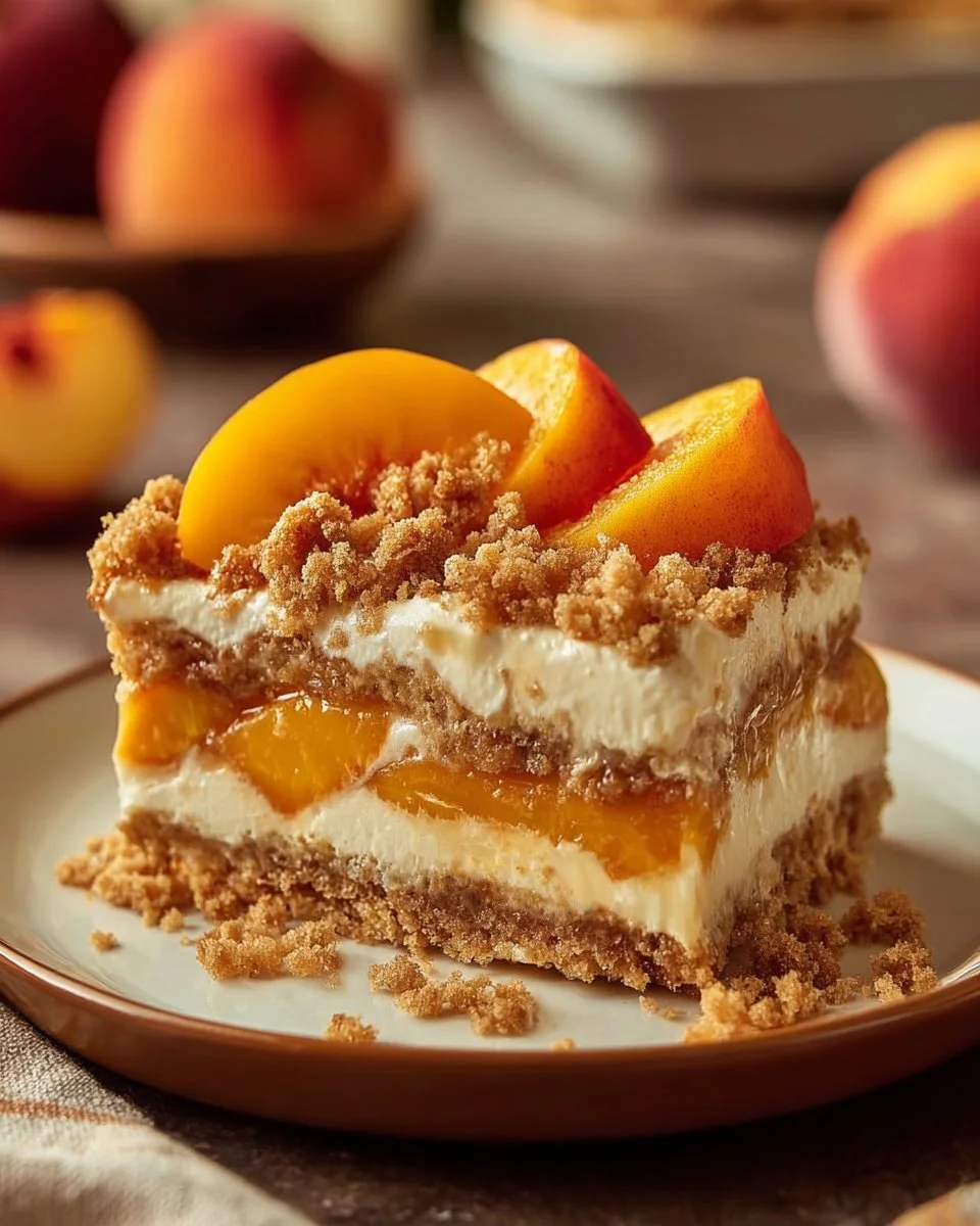 A delightful dessert combining creamy cheesecake with juicy peaches and a crispy crumble topping.