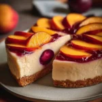 - Decorate and Chill: Top the cheesecake with additional peach and plum slices for decoration. Drizzle melted peach jelly over the top. Refrigerate for at least 4 hours or until fully set.