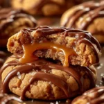 Delightful peanut butter cookies drizzled with salted caramel, combining rich flavors and a sweet touch for a perfect snack or dessert.