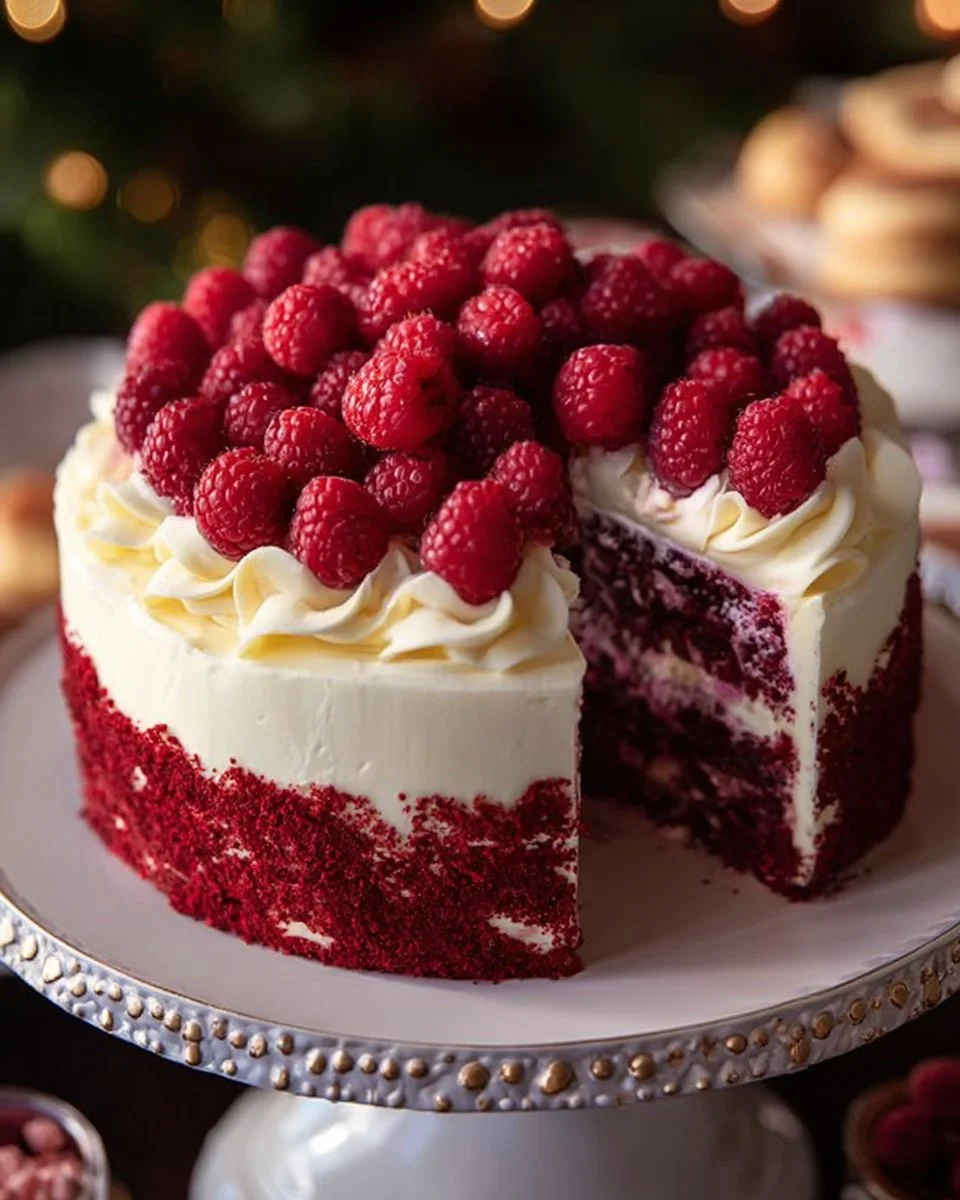 A delightful dessert combining rich red velvet cake and sweet tart raspberries, perfect for any celebration.