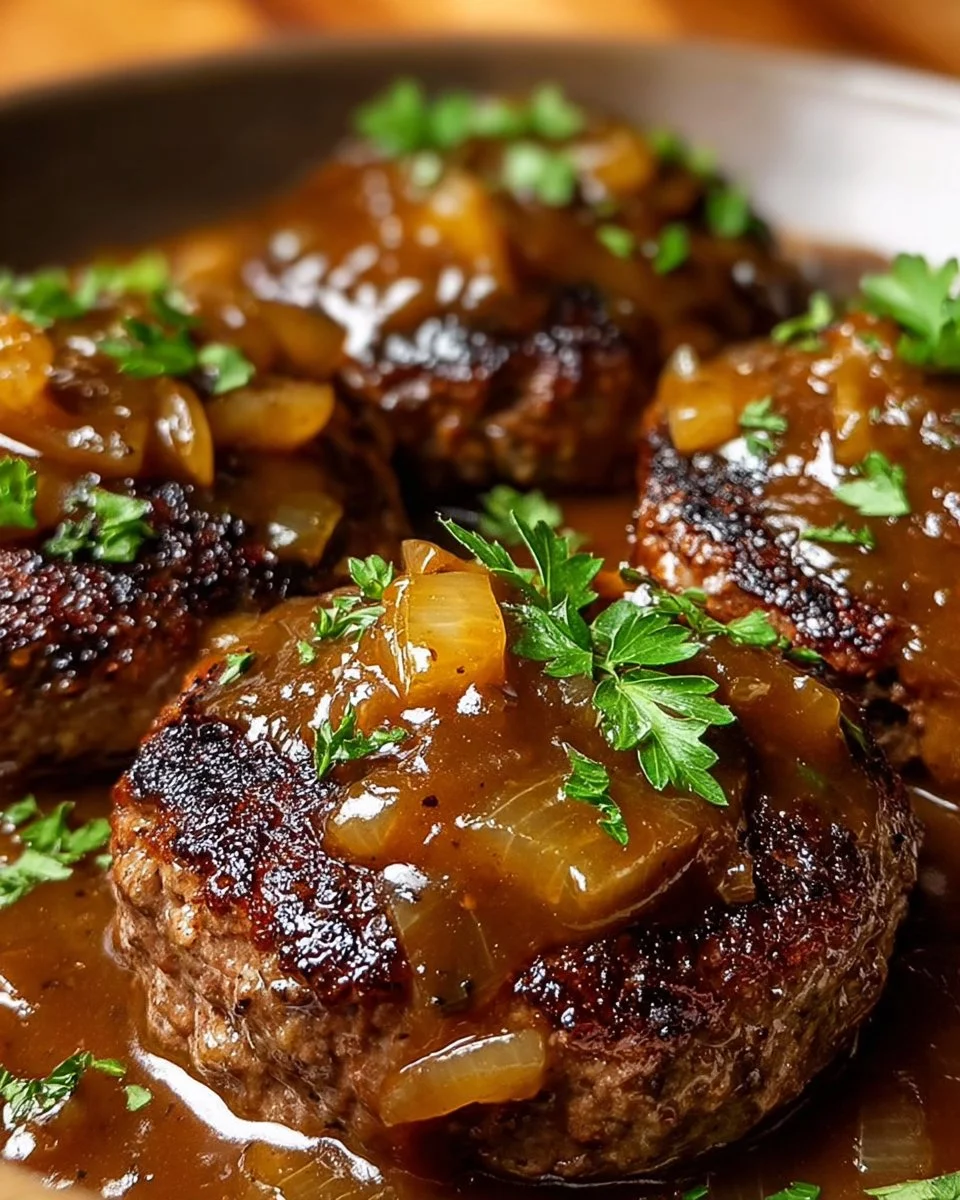 A hearty dish featuring seasoned ground beef patties simmered in a rich onion gravy, perfect for family dinners.