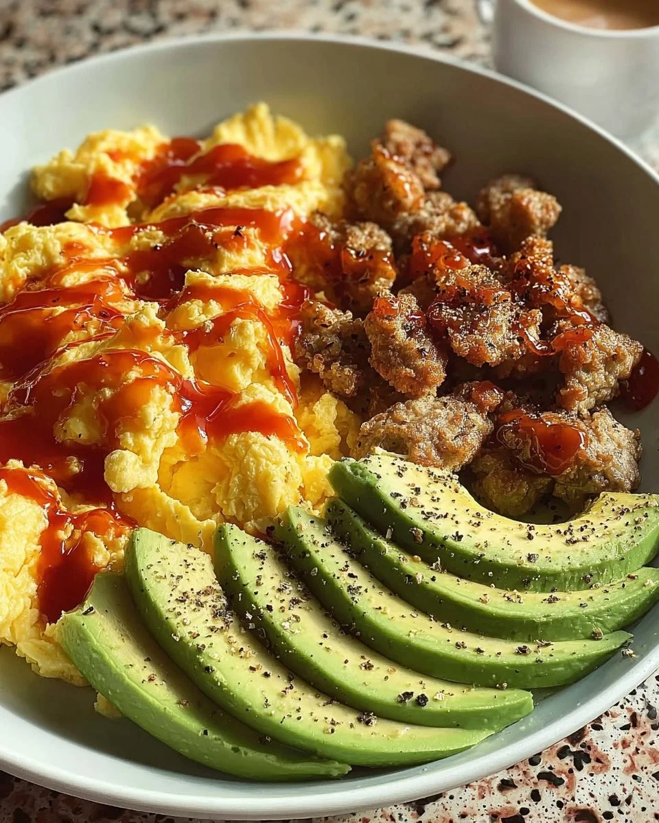 - Assemble the Plate: Arrange the eggs, sausage, and avocado side-by-side.