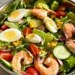 A delicious and healthy Shrimp & Egg Salad Bowl combining fresh ingredients, perfect for a light lunch or refreshing dinner.