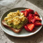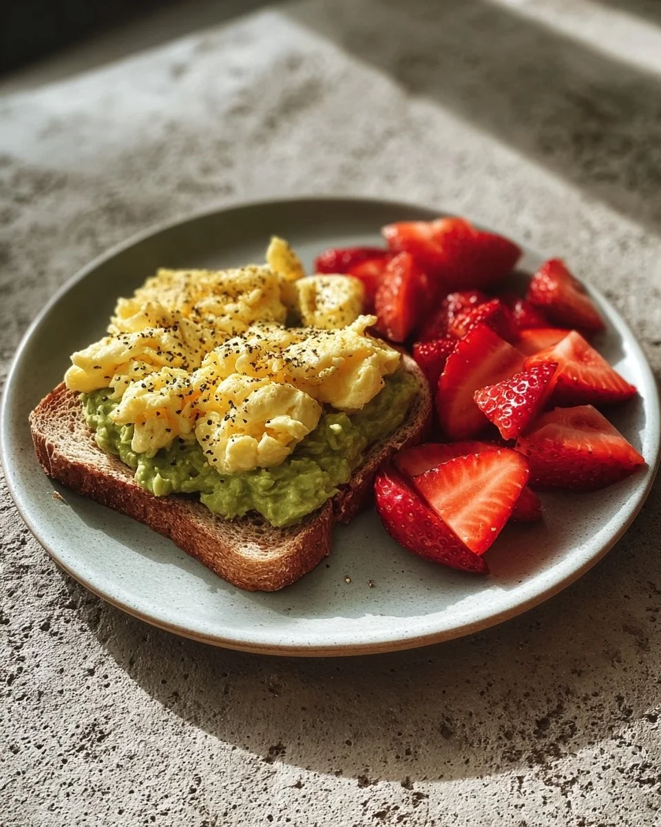 Keywords: avocado toast, scrambled eggs, healthy breakfast, quick meal, fresh strawberries