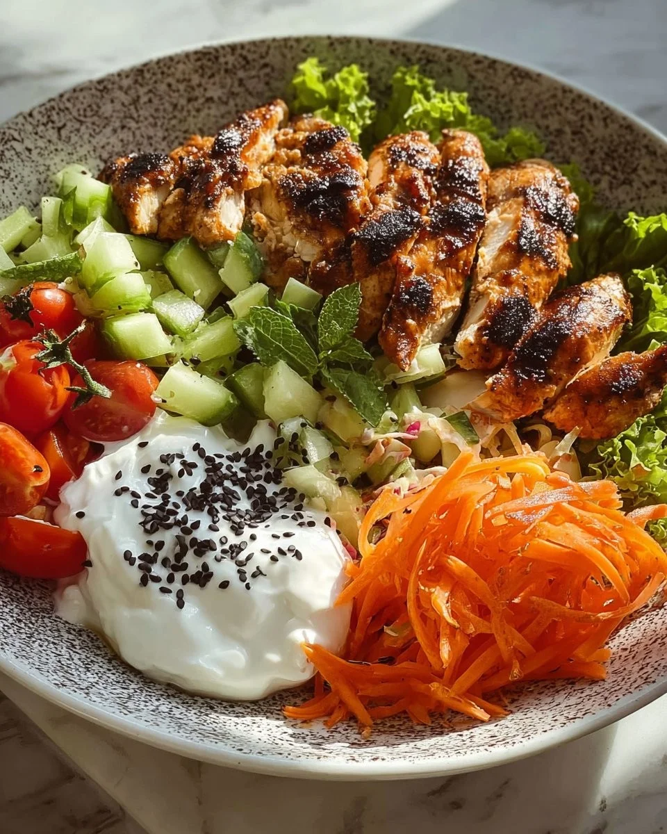 A delicious and healthy meal combining tender chicken, fresh veggies, and a creamy yogurt sauce.