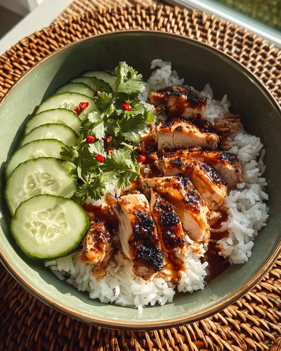 Assemble Your Bowl: Place rice at the bottom of a bowl, top with cucumber slices, and add the grilled chicken.
