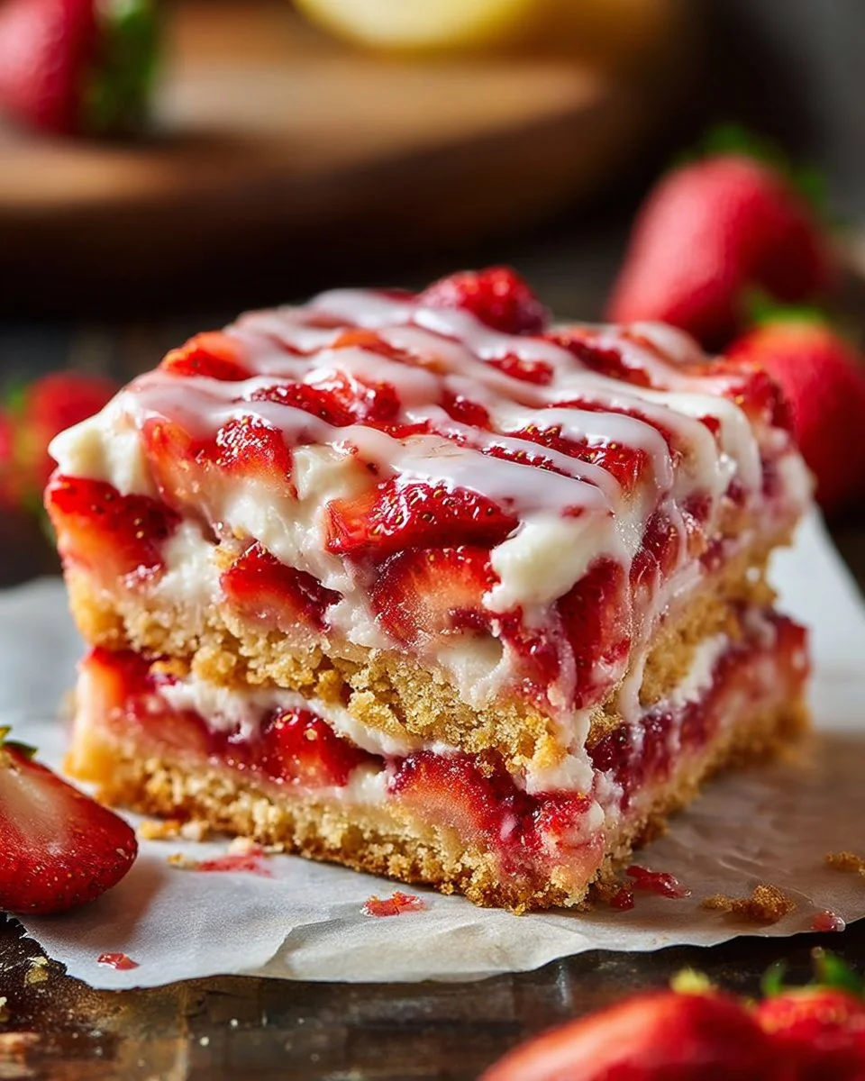Strawberry Crumble Bars with Lemon Icing are a delightful treat that brings a touch of summer to your kitchen. These bars combine the sweet, juicy flavor of strawberries with a crispy crumble topping and a zesty lemon icing. They are perfect for dessert or a sweet snack!