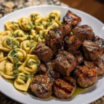 Tender Steak Bites with Pesto Alfredo Tortellini Sauce