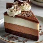 A rich and creamy cheesecake featuring layers of delightful chocolate flavors with a crunchy Oreo crust and a fluffy mousse topping.
