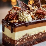 A rich and delightful dessert with layers of chocolate cake, creamy ganache, and silky mousse, perfect for any celebration.