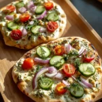 A fun twist on traditional pizza featuring tzatziki sauce, tender chicken, and fresh veggies on crispy naan or flatbread.