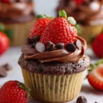 Delicious vegan muffins combining the rich taste of dark chocolate with fresh strawberries, perfect for breakfast or a sweet snack.