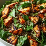 A nutritious and flavorful salad featuring roasted sweet potatoes, tender spinach, and hearty lentils, perfect for lunch or dinner.