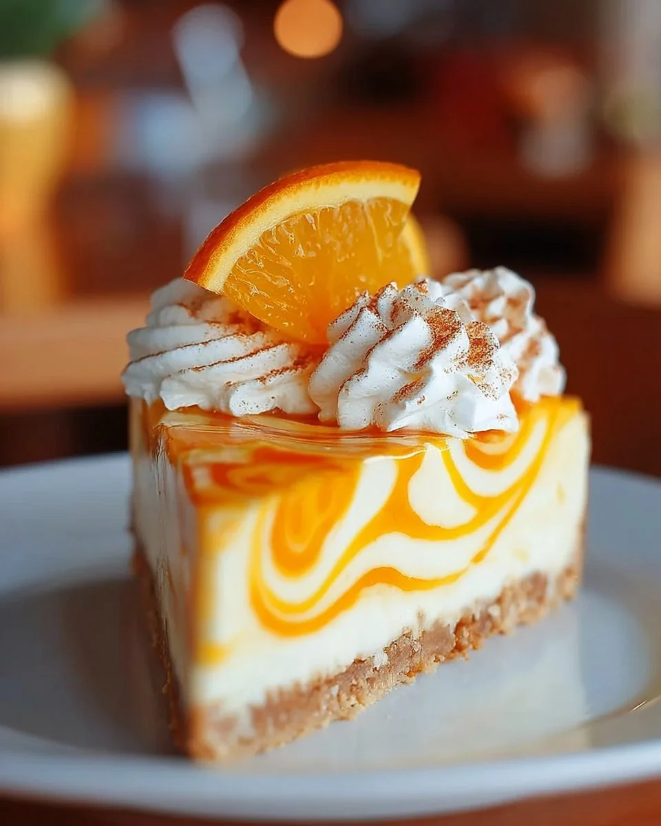 Before serving, top the cheesecake with whipped cream, orange slices, and a sprinkle of cinnamon for extra flavor and decoration.